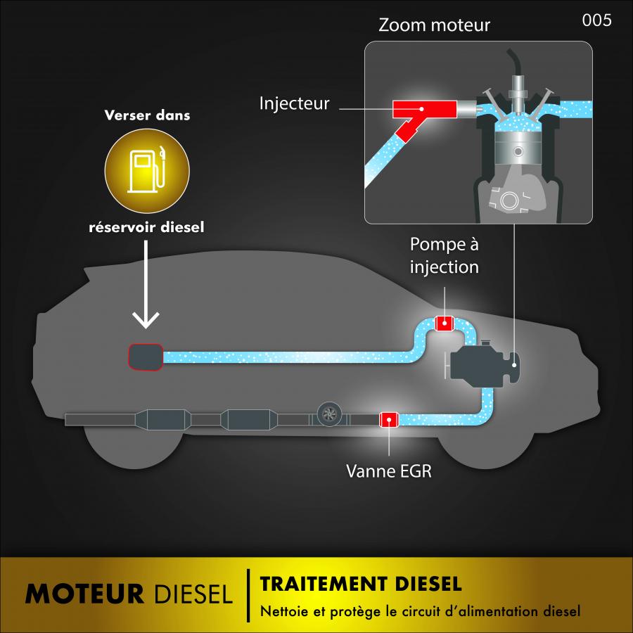 Synthetic additive for cleaning and protecting the entire diesel fuel supply and injection system. Prevents clogging of the pump, injectors, comb