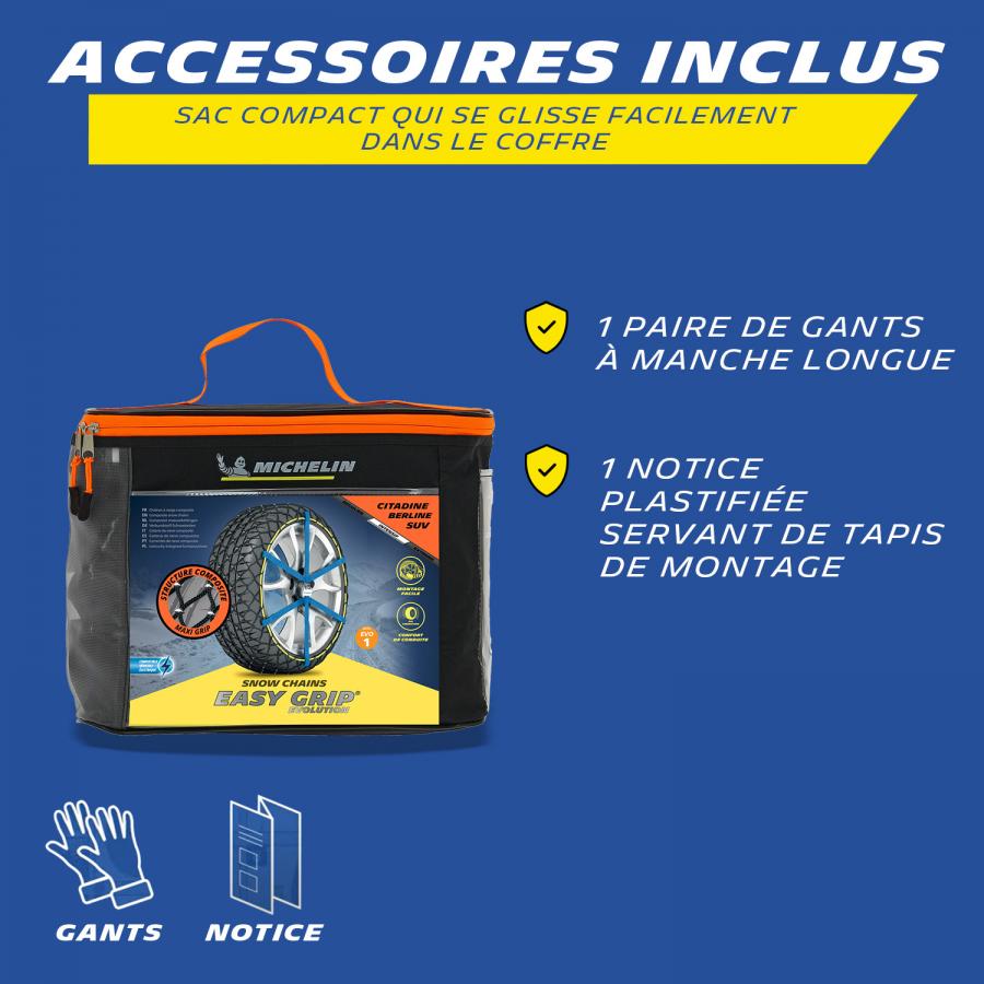 MICHELIN Easy Grip EVOLUTION is a high performance composite snow chain, easy to install. Exclusive composite structure ensuring maximum grip on snow and ice, in extrem conditions. Quick and easy to install and disassemble thanks to the new flexible fastening system. Night Vision Security system. Homologated in France and Italy. Contents of each bag: 1 pair of composite snow chains, one pair of gloves, 1 instruction manual.