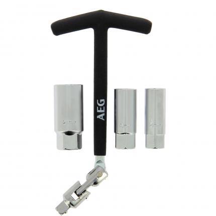 Swivelling spark plug spanner. Double knuckle joint with 3 assorted sockets for petrol spark plugs : 16mm - 18mm - 21 mm.