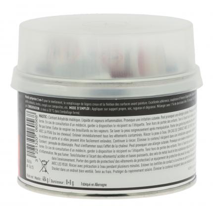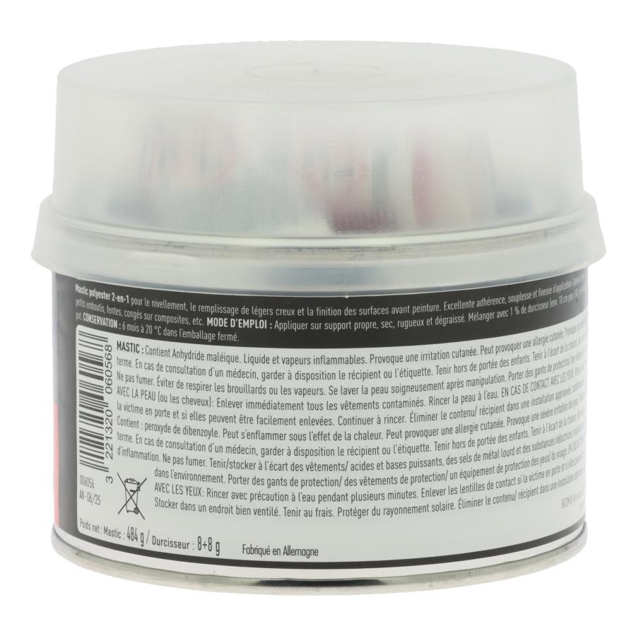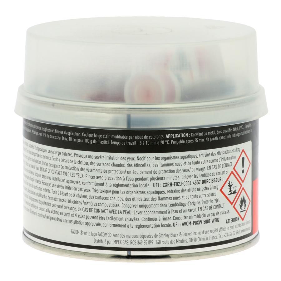 FACOM 2 in 1 flexible polyester putty 500g, a polyester mastic for filling and levelling surfaces, bumps and hollows. Benefits from a strong adhesion and excellent filling properties. Being a 2 in 1 mastic, it may also be used for final preparation of surfaces prior to painting. Colour : light beige, may be modified with additives.