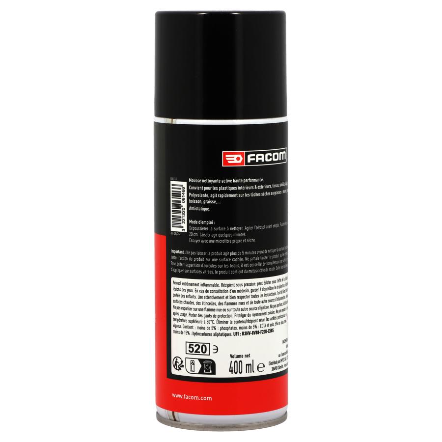 FACOM cleaning foam. 400ml, a high-performance foam to clean all surfaces. Versatile, will act rapidlyon dry or greasy stains, for example : marker pen, tar, oil, resin, drinks, grease, etc. Effective on all washable surfaces: interior and exterior plastics, cloths , bodywork, windows, metalwork.