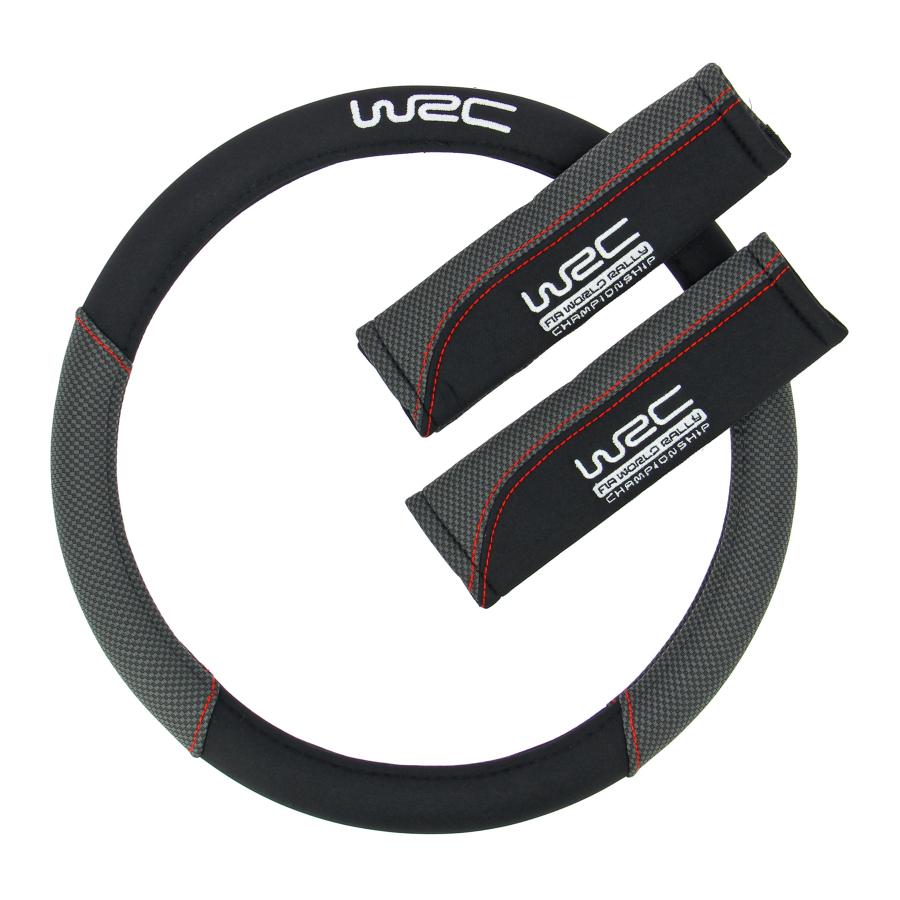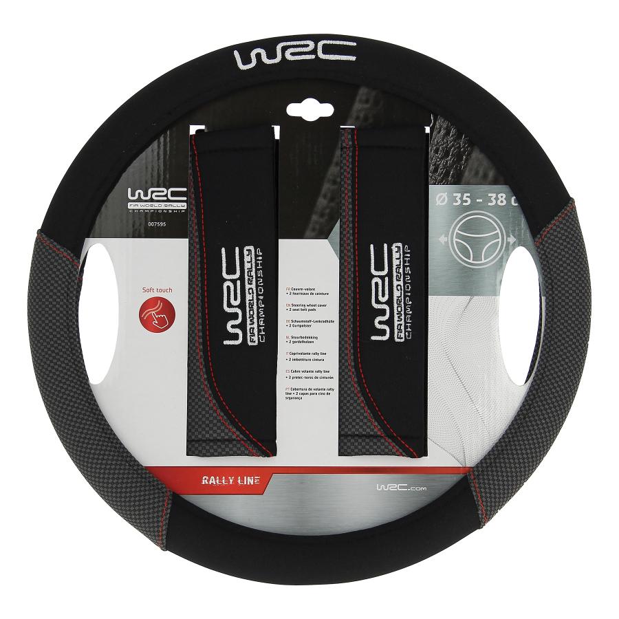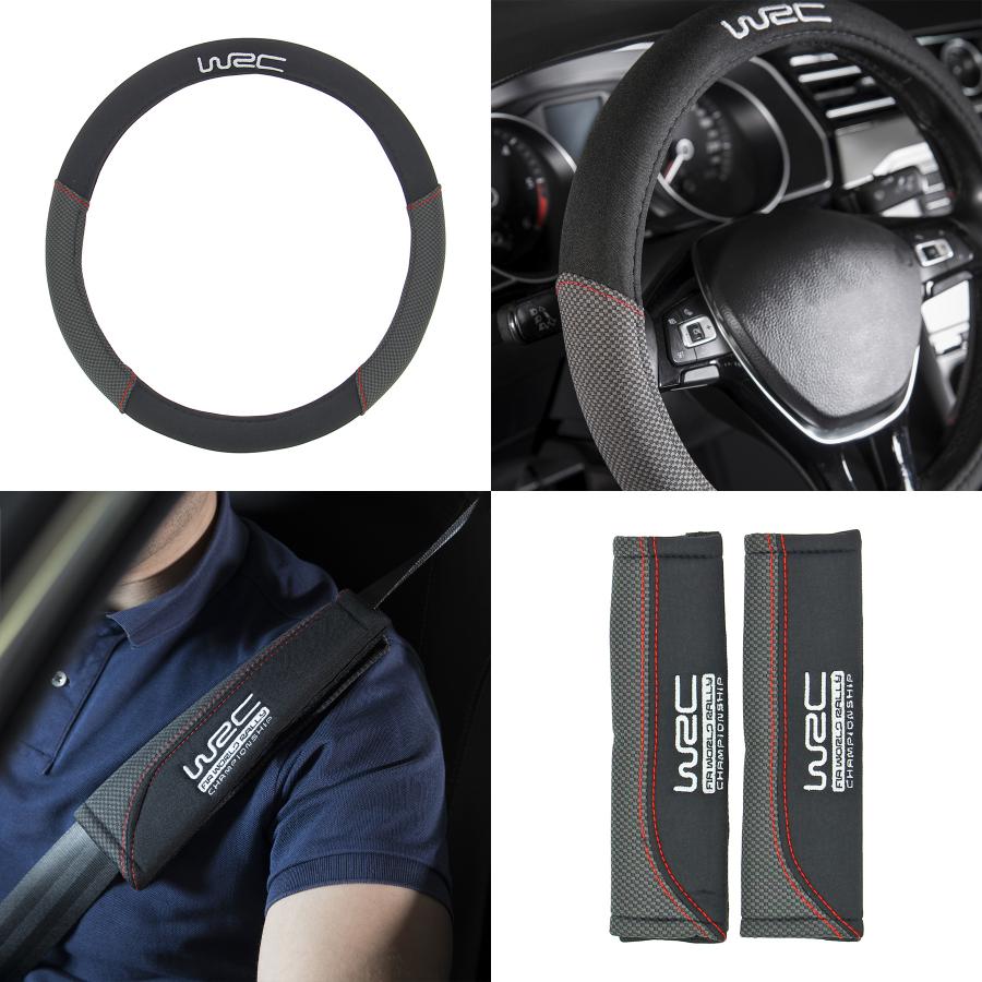 WRC steering wheel cover + 2 seat belt pads A set of three WRC products for a sporty drive 2 WRC seat belt pads to limit the fraying of seatbelts and improve comfort 1 universal WRC steering wheel cover