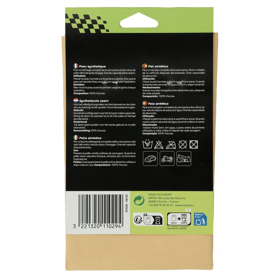 CARLinéa Synthetic Leather. For complete drying of bodywork and windows after rinsing. Great capacity of absorption. Can be used for the drying of all surfaces. Composition: 100% viscose. Dimensions 40x50cm.