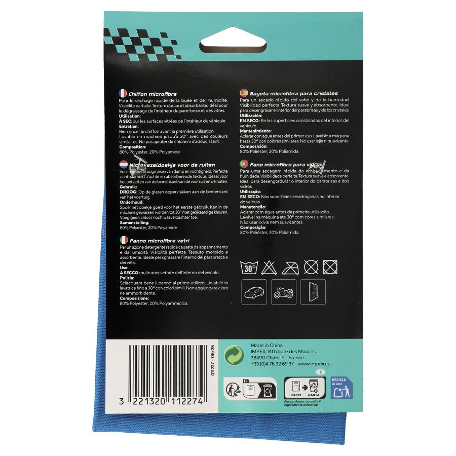 CARLinéa Microfibre Cloth for Windows Microfibre Cloth 75% polyester and 25% polyamide, 210 g Effective for any wash, or to unclog or clean. The smooth texture of this microfibre cloth degreases all glass surfaces for transparency and a perfect visibility. Cleaning and very absorbent, it allows you to dry and wipe quickly the windows of your vehicle as well as the delicate surfaces without any trace or wicking. Cleaning after use : Wash separately to 40°