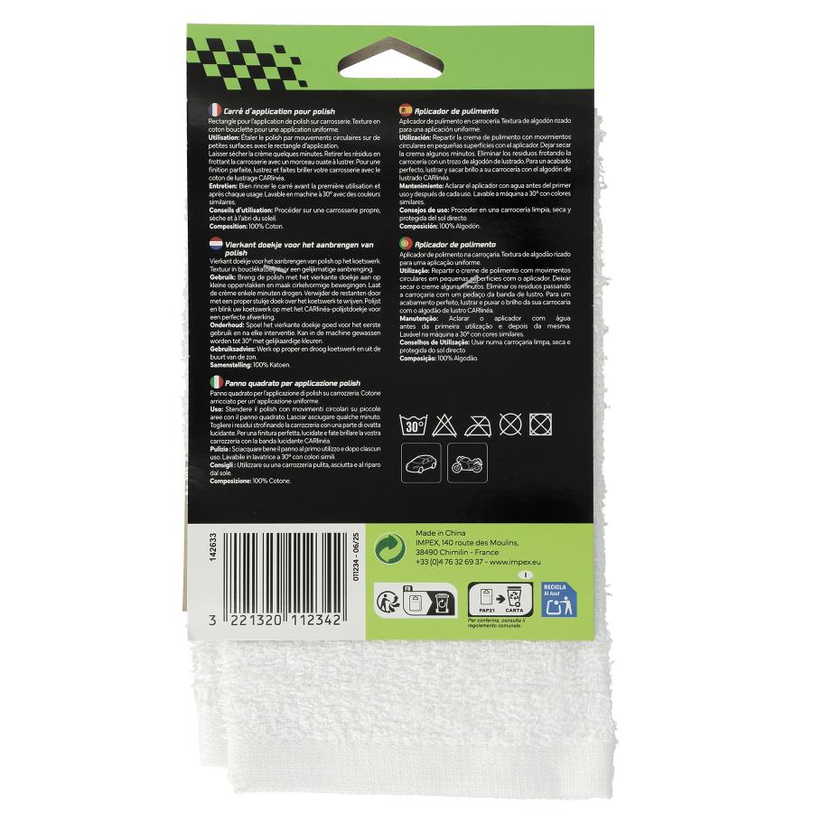 CARLinéa Squared Cotton Polishing Cloth 46x40cm Cotton cloth for shining bodywork after applying polish Cleaning after use : use soap Dimensions : 46 cm x 40 cm
