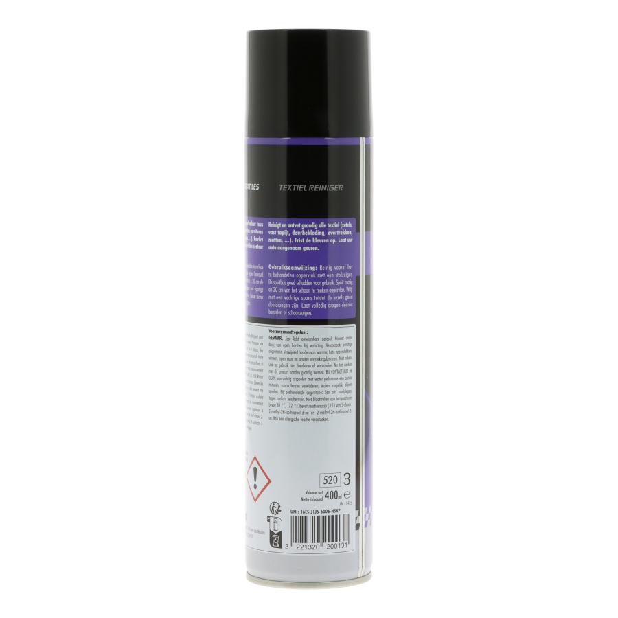 Deep-cleans, degreases and disinfects all textiles : seats, carpets, covers, carpets, door linings etc. Revives colours. Its exclusive formula fights against mites. Spray 400 ml.