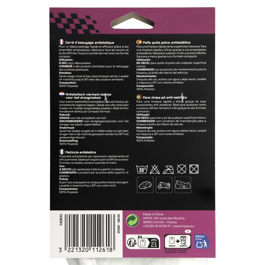 CARLinéa Antistatic Fur Pad Square of 100% polyester fur 195 mm x 195 mm. The fur side, anti-dusting and antistatic, is ideal for shining plastic. Used alone, it attracts dust effectively. Ideal for the difficult acces and corners. Washable fabric at 30°C.
