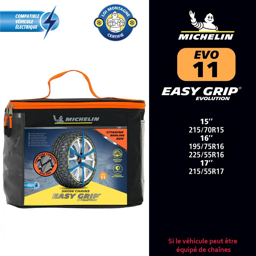 MICHELIN Easy Grip EVOLUTION is a high performance composite snow chain, easy to install. Exclusive composite structure ensuring maximum grip on snow and ice, in extrem conditions. Quick and easy to install and disassemble thanks to the new flexible fastening system. Night Vision Security system. Homologated in France and Italy. Contents of each bag: 1 pair of composite snow chains, one pair of gloves, 1 instruction manual.