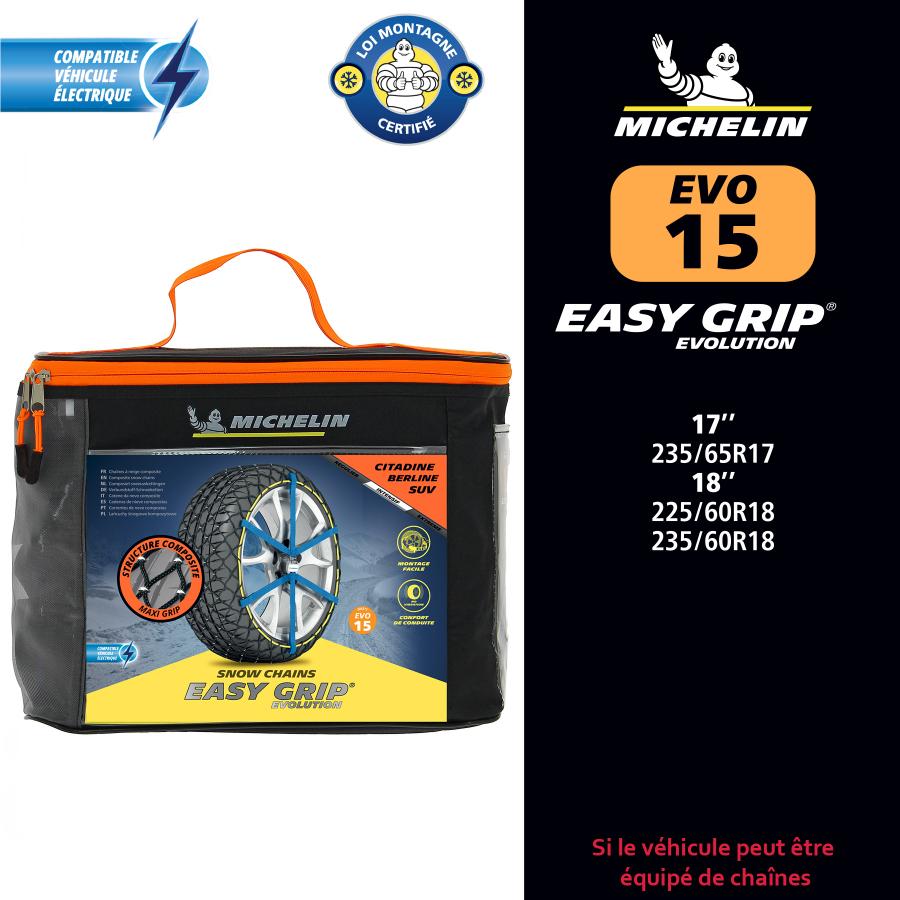 MICHELIN Easy Grip EVOLUTION is a high performance composite snow chain, easy to install. Exclusive composite structure ensuring maximum grip on snow and ice, in extrem conditions. Quick and easy to install and disassemble thanks to the new flexible fastening system. Night Vision Security system. Homologated in France and Italy. Contents of each bag: 1 pair of composite snow chains, one pair of gloves, 1 instruction manual.