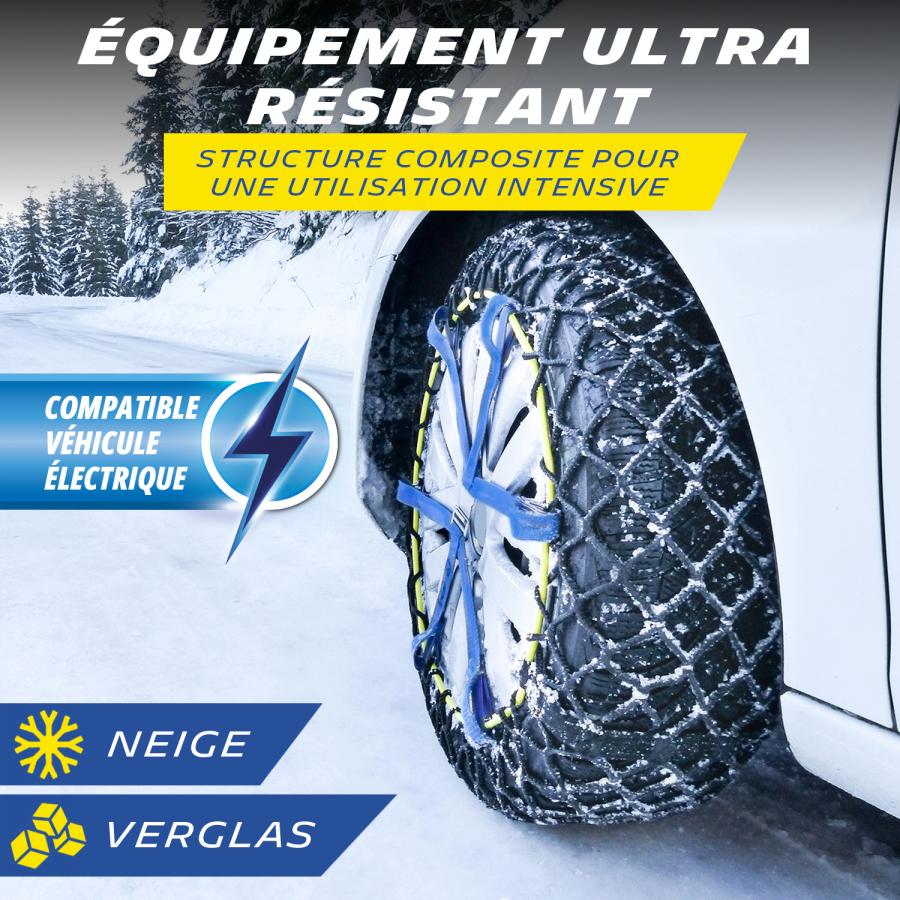MICHELIN Easy Grip EVOLUTION is a high performance composite snow chain, easy to install. Exclusive composite structure ensuring maximum grip on snow and ice, in extrem conditions. Quick and easy to install and disassemble thanks to the new flexible fastening system. Night Vision Security system. Homologated in France and Italy. Contents of each bag: 1 pair of composite snow chains, one pair of gloves, 1 instruction manual.