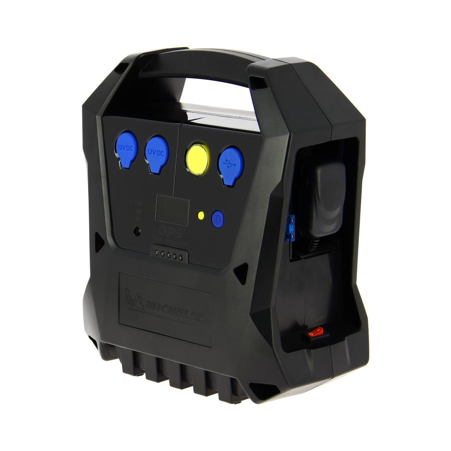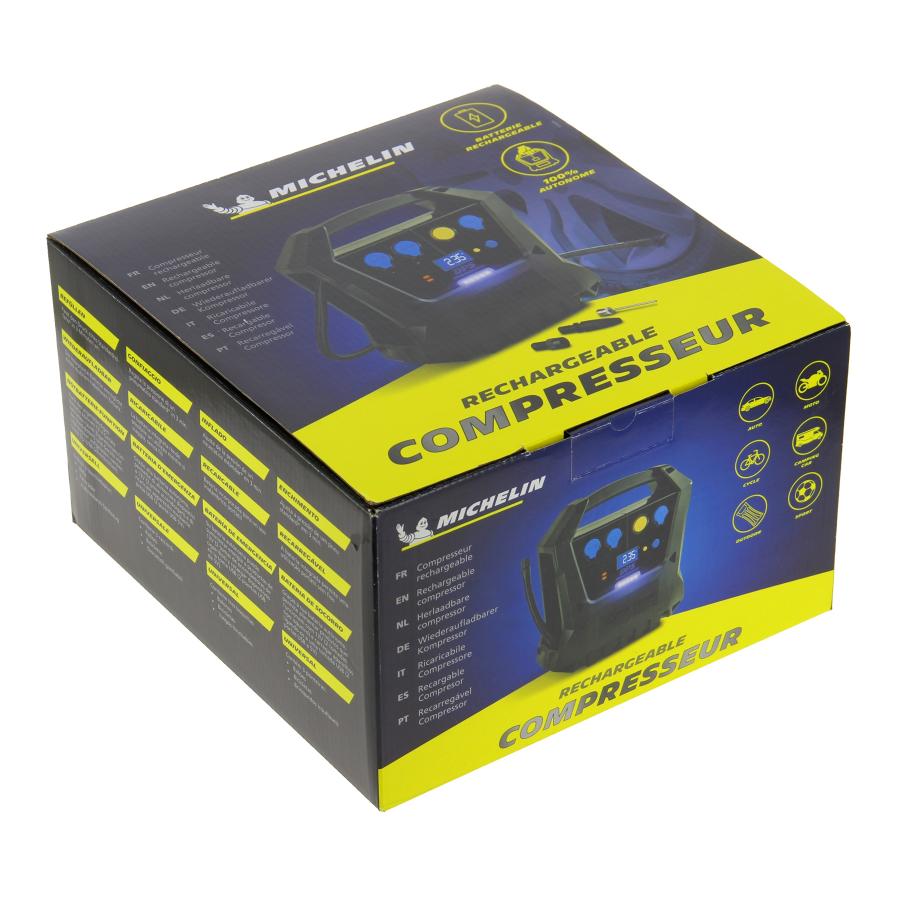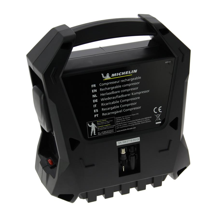 Cordless air compressor. The inbuilt battery makes it ideal for cord-free use on the go. Adjust the pressure of a standard tyre in 3 minutes Thanks to its stand-alone battery, it can power 12 V products (2 accessory sockets) and recharge devices (2 x 5 V USB ports). Universal : Contains three valves: Balls, bicycle tyres, inflatable toys. 3 pressure units : Bar, PSI, Kpa. 5 Superbright LED lights. 60 cm (approx.) high pressure air hose with tyre valve connector. Inflates car tyres up to 2.80 bars. Inflates bike tyres up to 8.3 bars. A fully charged battery will give appoximately 10 inflations from 0 to 2 bars.