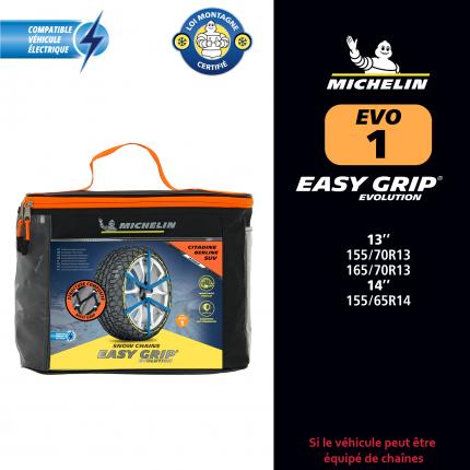 MICHELIN Easy Grip EVOLUTION is a high performance composite snow chain, easy to install. Exclusive composite structure ensuring maximum grip on snow and ice, in extrem conditions. Quick and easy to install and disassemble thanks to the new flexible fastening system. Night Vision Security system. Homologated in France and Italy. Contents of each bag: 1 pair of composite snow chains, one pair of gloves, 1 instruction manual.