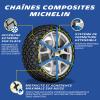 MICHELIN Easy Grip EVOLUTION is a high performance composite snow chain, easy to install. Exclusive composite structure ensuring maximum grip on snow and ice, in extrem conditions. Quick and easy to install and disassemble thanks to the new flexible fastening system. Night Vision Security system. Homologated in France and Italy. Contents of each bag: 1 pair of composite snow chains, one pair of gloves, 1 instruction manual.