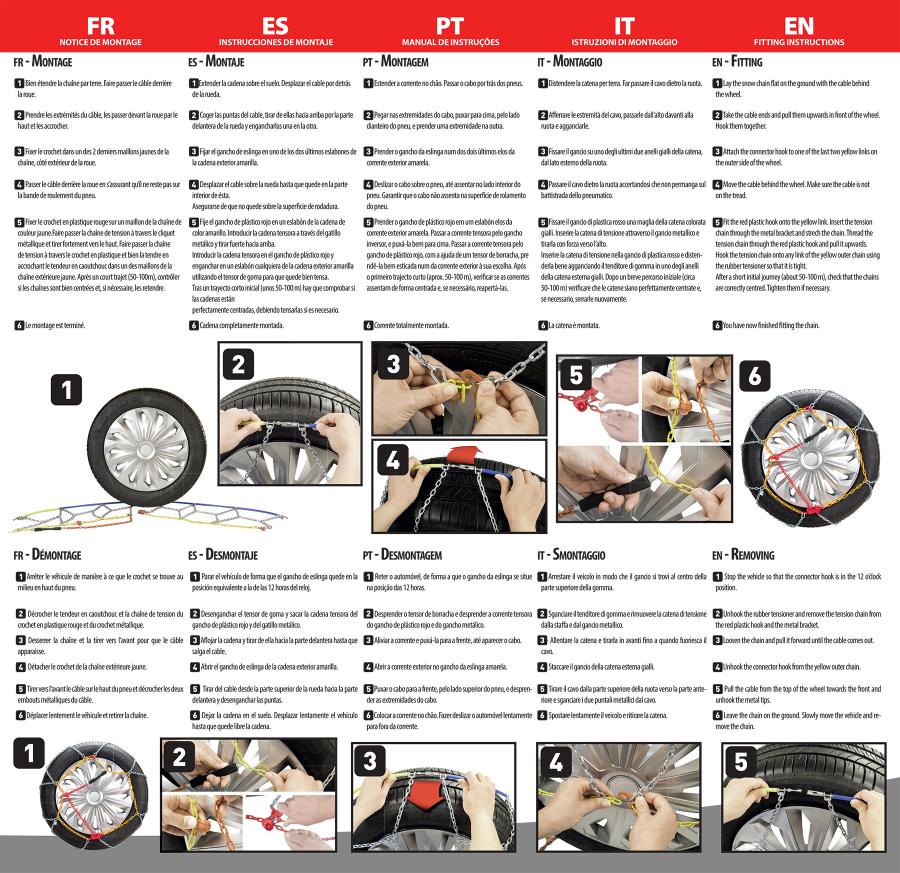 Steel snow chains with, size 80. Self-locking manual tension systeme. Fast assembly without moving the vehicle. 9mm links in high corrosion resistant steel. Packaged in white plastic box containing 1 pair of gloves, 1 instructions for use and spare links. B26 Conform ONORM V5117