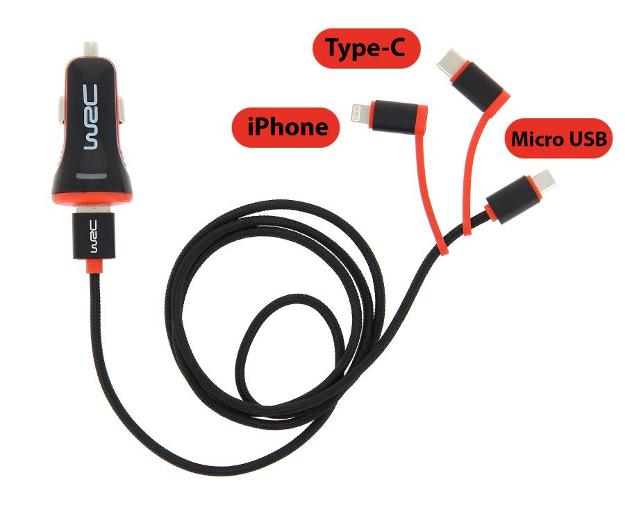 WRC CARGADOR + CABLE 3 EN 1 Kit de toma encendedor 2.4A con LED indicador de funcionamiento + cable de carga y data transfer de alta calidad. El cable de carga está reforzado y revestido de tela y dispone de 3 conectores para móvil, tablet, ordenador o cualquier dispositivo equipado con micro-USB, USB-C o iPhone Lightning. Carga rápida. Longitud del cable: 1 metro Entrada: CC 12-24 V, Salida: 5 V - 2,4 A.