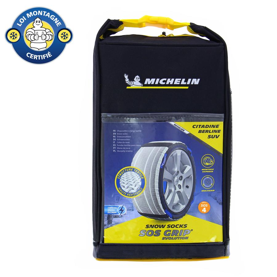 MICHELIN CADENAS DE NIEVE CALCETIN TEXTIL SOS EVO 4 Calcetines de Nieve Textiles de Alto rendimiento y fácil de instalar. Proporciona a los conductores un excelente agarre, máxima tracción y facilidad de montaje, sin esfuerzo, en menos de dos minutos. Gracias al desarrollo de las Bandas Multi textiles Ultra absorbentes, el rendimiento de los calcetines SOS GRIP® EVOLUTION aumenta un +50% en la nieve al arrancar. La banda de rodadura de poliéster de alta resistencia permite reutilizar el producto durante varias temporadas. También compatible con dispositivos ESP y ABS, este calcetín para nieve no genera vibraciones durante la conducción. Especialmente indicado para un uso de emergencia en carreteras nevadas, en distancias cortas y a una velocidad máxima de 50 km/h. También apto para vehículos con pasos de rueda reducidos. Gracias a su bolsa ultra compacta, estarán siempre a mano.