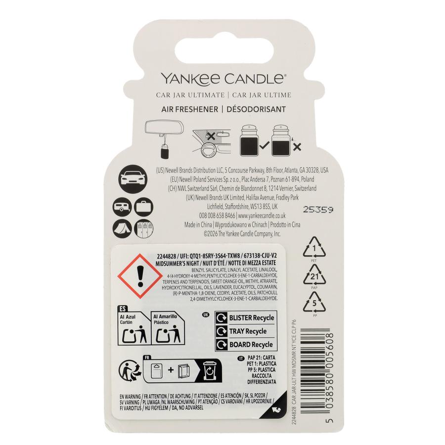 YANKEE CANDLE MISDSUMM NIGHT (COLGAR) ¡Yankee Candle, la marca esencial de fragancias para el hogar, llega a tu vehículo| Neutraliza los olores y refresca el auto, con el nuevo Car Jar® Ultimate. Cada Car Jar® Ultimate brinda hasta cuatro semanas de fragancia ininterrumpida. Fragancia de coco negro: puesta de sol en el paraíso coco gourmet, sándalo y flores de la isla para la promesa de una noche de tranquilidad refinada. Para colgar en el retrovisor.