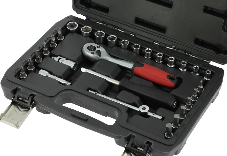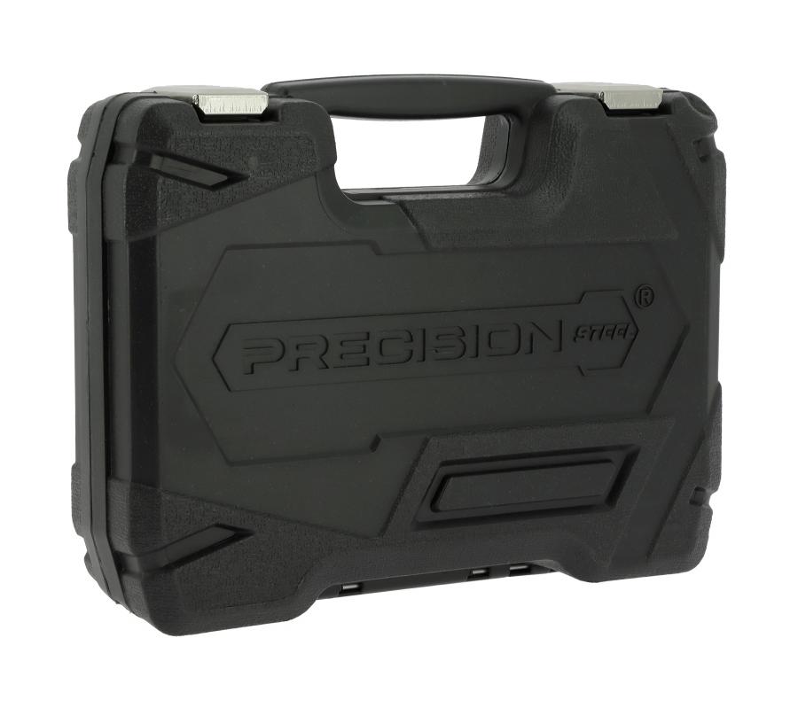 PRECISIÓN STEEL MALETIN HERRAMIENTAS 29 PIEZAS 1/4' Compuesto por: 1 carraca reversible 1 mango deslizante 1 extensión 50 mm 1 cardán 1 mango 12 vasos de 4 a 13 mm 3 puntas de destornillador Phillips 3 puntas de destornillador planas 6 Puntas hexagonales para destornillador - En tipo Cromo Vanadio profesional,