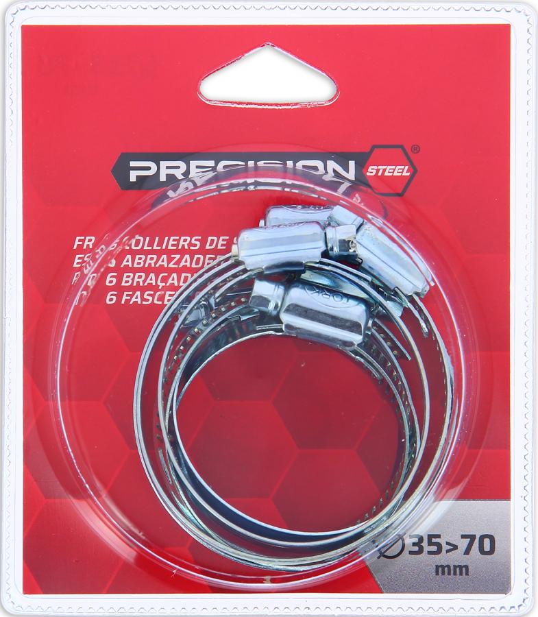 PRECISION STEEL 6 ABRAZADERAS 35-70 MM Juego de 6 abrazaderas para manguera: - 2 abrazaderas de 35 a 50 mm - 2 abrazaderas de 40 a 60 mm - 2 collares de 50 a 70 mm Ancho de banda de 9 mm.