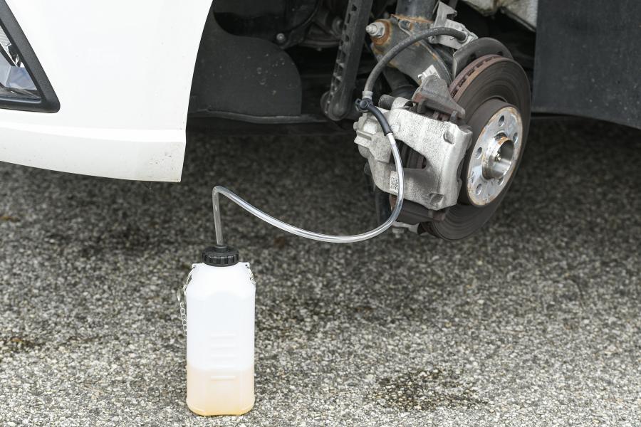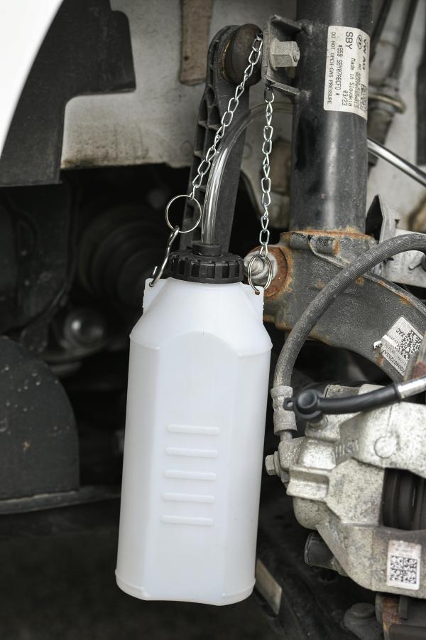 Permite purgar el sistema hidráulico (freno o embrague). Manguera transparente de 60 cm, 8 mm de diámetro. Conexión especial para el tornillo de purga. Material anticorrosivo para líquido de frenos DOT. Recipiente de recuperación de líquido de frenos de 1 L. Permite purgar todo el sistema de frenado (4 ruedas). Recipiente graduado. Cadena de sujeción.