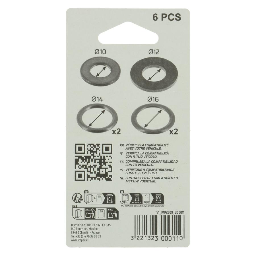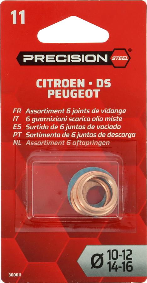 XLTECH SURTIDO 6 JUNTAS TAPONES DE DRENAJE ESPECIALES CITROEN/DS/PEUGOT Asignaciones principales: CITROEN, DS, PEUGEOT. Composición : 1 junta de fibra de diámetro 12/24 mm 1 junta de cobre CUA diámetro 10/20 mm, espesor 2 mm 2 juntas KFC diámetro 14/20mm, espesor 2mm 2 juntas KFC diámetro 16/22 mm, espesor 2 mm Resistente al calor, aceite, gas, agua y la mayoría de líquidos y disolventes a base de silicona.