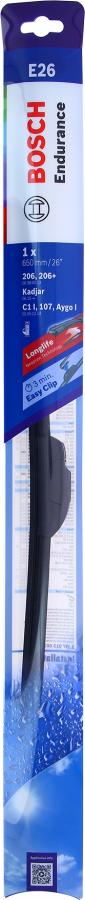 BOSCH 1 ESCOBILLA E26-650MM ENDURANCE RETRACTIL Con los limpiaparabrisas Bosch tendrá una visión clara con toda seguridad: Gracias a la innovadora goma utilizada, las 1 ESCOBILLAs mejoradas y el rendimiento prolongado demostrado. Los limpiaparabrisas Bosch permiten la mejor visión y seguridad.