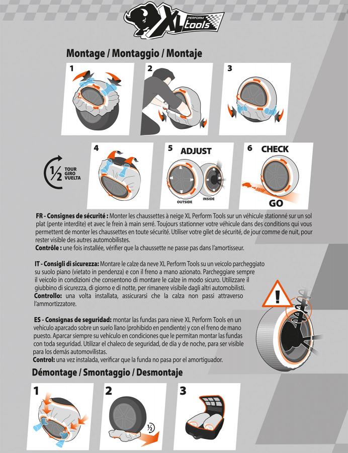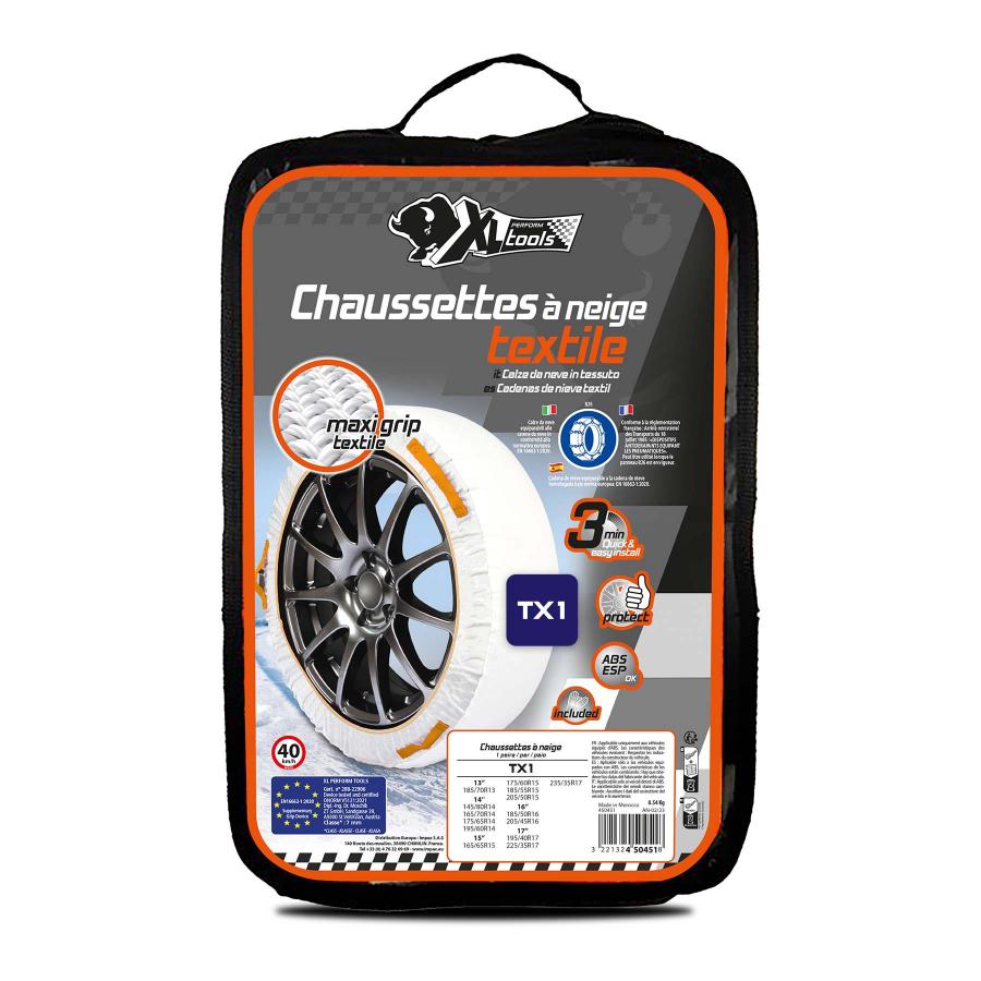 XLPT DE CADENAS NIEVE TX1 Cadenas de nieve textil 100% poliéster. Alta resistencia a la fricción. Adherencia: -Por absorción del agua entre la calzada y la rueda. -Por micro rugosidades del tejido en relieve -Dos bandas elásticas planas (interior y exterior) -Fuerzas de rappel mejor repartidas minimizando la centrifugación del producto. -Excelente evacuación de la nieve circulando -Adaptadas a la mayoría de los vehículos con cadenado particular -Colocación fácil y rápida: asas en las bandas laterales que permiten un mejor manipulado del producto durante el montaje y desmontaje.