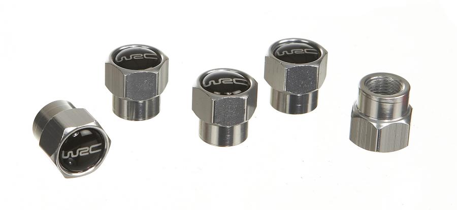WRC 5 TAPONES DE VALVULAS NEGROS 5 tapones de válvula aluminio WRC. Medida estándar. Se adaptan a la mayoría de las válvulas. Fabricadas en aluminio moldeado, con tuercas y emblema WRC de epoxi negro. Garantizan un acabado perfecto para tus llantas.