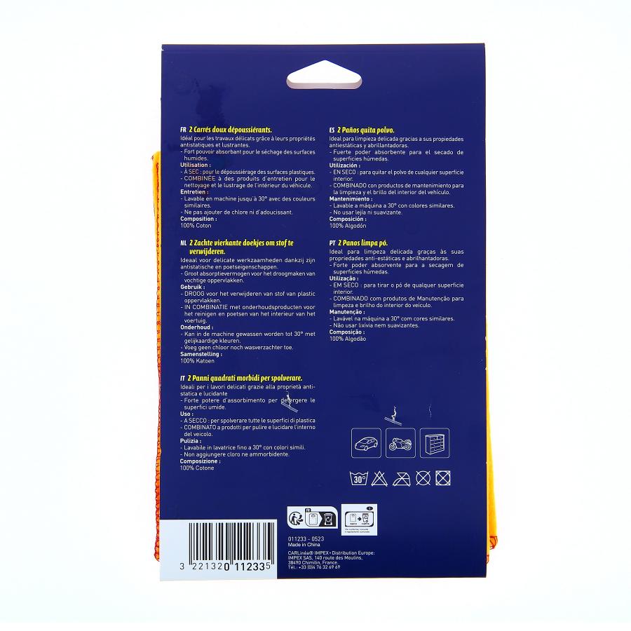 CARLINEA LOTE 2 PA#OS PARA EL POLVO Ideal para sacar el polvo, limpiar y abrillantar. Uso: - Seco: para la eliminación de polvo de superficies plásticas, - Combinado con productos de mantenimiento para limpiar y pulir el interior del vehículo Mantenimiento: Lavable a máquina hasta 30[ con colores similares. No agregue cloro ni suavizante de telas. Composición: 90% algodón, 10% poliéster Dimensiones: 50x40 cm