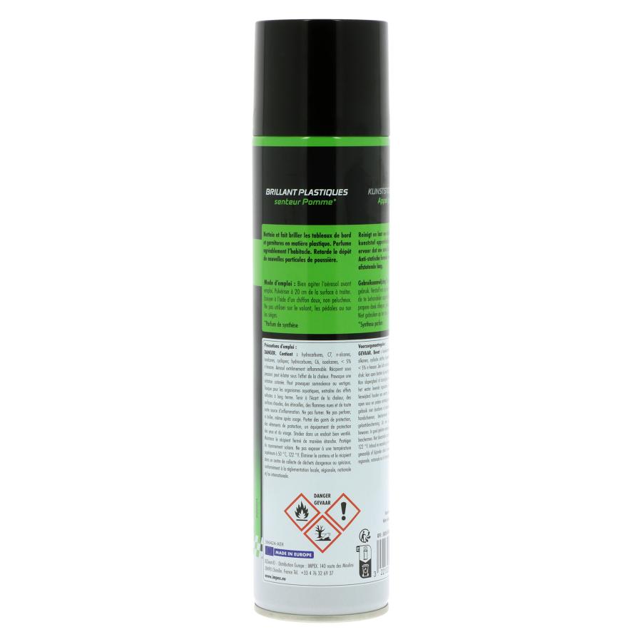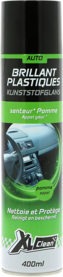 XL CLEAN ABRILLANTADOR PLASTÍCOS MANZANA 400ML Este plástico brillante limpia y brilla los tableros y los adornos de plástico. Perfuma agradablemente la cabina. Retrasa la deposición de nuevas partículas de polvo. - Restaura el brillo de las nuevas superficies tratadas. - Fórmula antiestática. - Eficiencia instantánea. - Aromatizado con MANZANA Aerosol 400 ml. Instrucciones de uso: Agite bien el aerosol antes de usarlo. Pulverizar a 20 cm de la superficie a tratar. Limpie con un pa¦o suave y sin pelusa. No usar en volante, pedales o asientos.