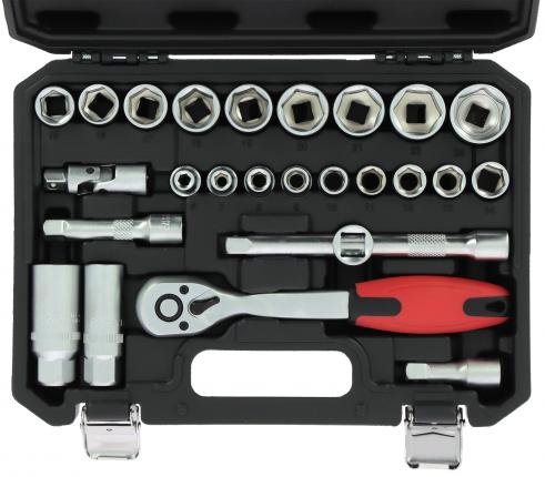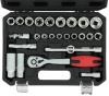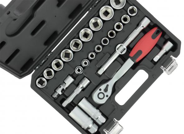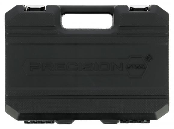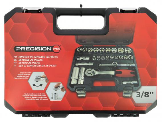 PRECISIÓN STEEL MALETIN HERRAMIENTAS 26 PIEZAS 3/8' Compuesto por: 1 carraca reversible 1 empu¦adura corredera 3 extensiones de 40, 75 y 150 mm 1 cardán 18 vasos de 6 a 24 mm 2 vasos para bujías de 16 y 21 mm - En Cromo Tipo profesional de vanadio