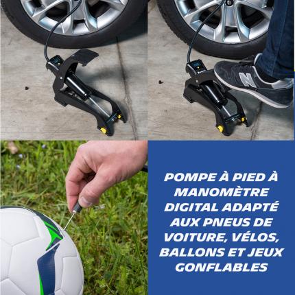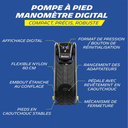MICHELIN BOMBA DE PIE 1 CILINDRO CON MANOMETRO DIGITAL Precisión 0,05 bares hasta 7 bares. Manómetro digital para mayor precisión. Manguera de nailon de 60 cm, punta de latón. Sistema de bloqueo de pedal simplificado. Pies de goma antideslizantes.