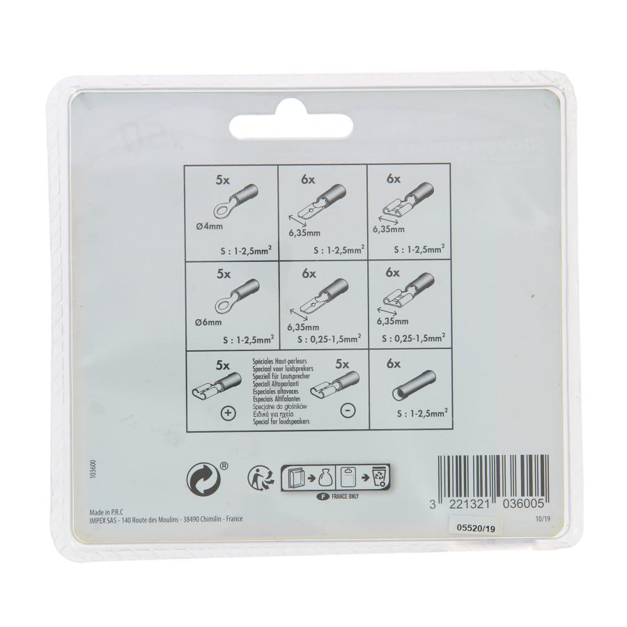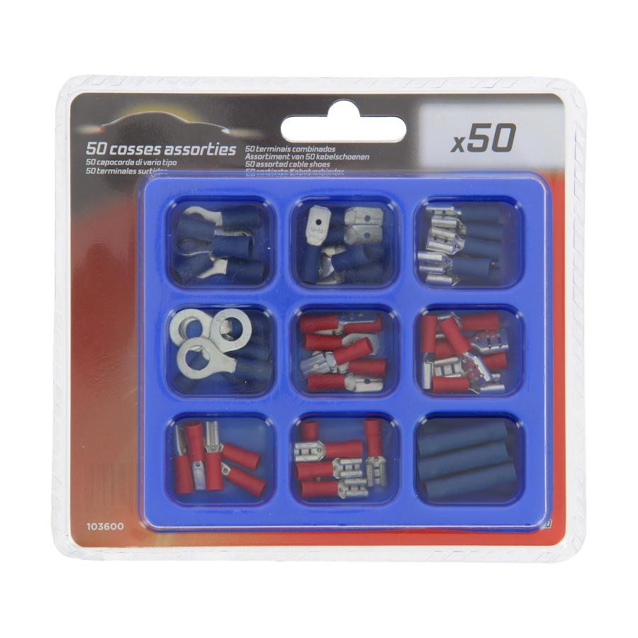 XLTECH 50 TERMINALES SURTIDOS Caja 50 terminales. Composición: - 6x terminales planos/hembra/aislados/azul 6,35mm /sección 1-2,5mm² - 6x terminales planos/macho/aislados/azul 6,35mm /sección 1-2,5mm² - 6x terminales planos/macho/aislados/rojo 6,35 mm /sección 0,25-1,5 mm² - 6x terminales planos/hembra/aislados/rojo 6,35 mm /sección 0,25-1,5 mm² - 5x terminales especiales A.V 2,8mm / sección 0,25-1,5mm² - 5x terminales especiales A.V 4,8mm / sección 0,25-1,5mm² - 6x conectores punta a punta azul sección 1-2,5mm² - 5x terminales arandela azul diam 4mm / sección 1-2,5mm² - 5x terminales arandela azul diam 6mm / sección 1-2,5mm² Material: latón/PVC