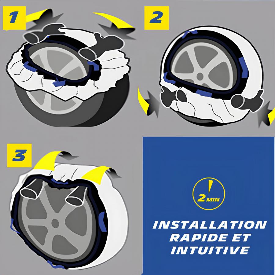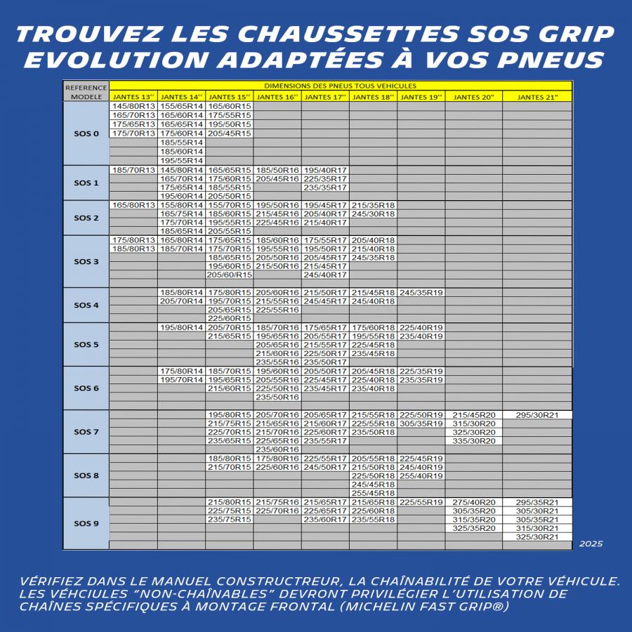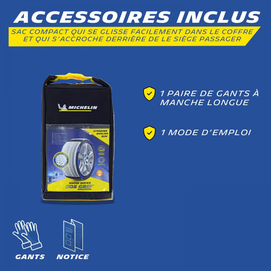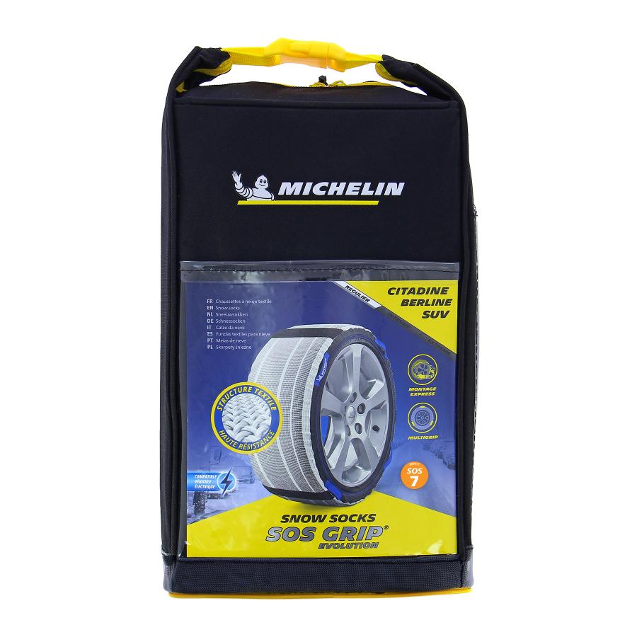 MICHELIN CADENAS DE NIEVE CALCETIN TEXTIL SOS EVO 7 Calcetines de Nieve Textiles de Alto rendimiento y fácil de instalar. Proporciona a los conductores un excelente agarre, máxima tracción y facilidad de montaje, sin esfuerzo, en menos de dos minutos. Gracias al desarrollo de las Bandas Multi textiles Ultra absorbentes, el rendimiento de los calcetines SOS GRIP® EVOLUTION aumenta un +50% en la nieve al arrancar. La banda de rodadura de poliéster de alta resistencia permite reutilizar el producto durante varias temporadas. También compatible con dispositivos ESP y ABS, este calcetín para nieve no genera vibraciones durante la conducción. Especialmente indicado para un uso de emergencia en carreteras nevadas, en distancias cortas y a una velocidad máxima de 50 km/h. También apto para vehículos con pasos de rueda reducidos. Gracias a su bolsa ultra compacta, estarán siempre a mano.