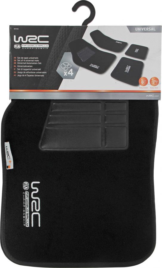 WRC JUEGO 4 ALFOMBRAS DE MOQUETA NEGRAS Juego completo de alfombrillas universales de moqueta negra. Acabado con trenza negra y bordado WRC plateado en cada tapete. Del lado del conductor, una talonera de seguridad de PVC. Medidas: alfombra delantera 66cmx42cm, alfombra trasera 41cmx30cm. Respaldo recubierto de PVC con púas y cierres de velcro para mayor estabilidad de la alfombra con su sistema antideslizante.