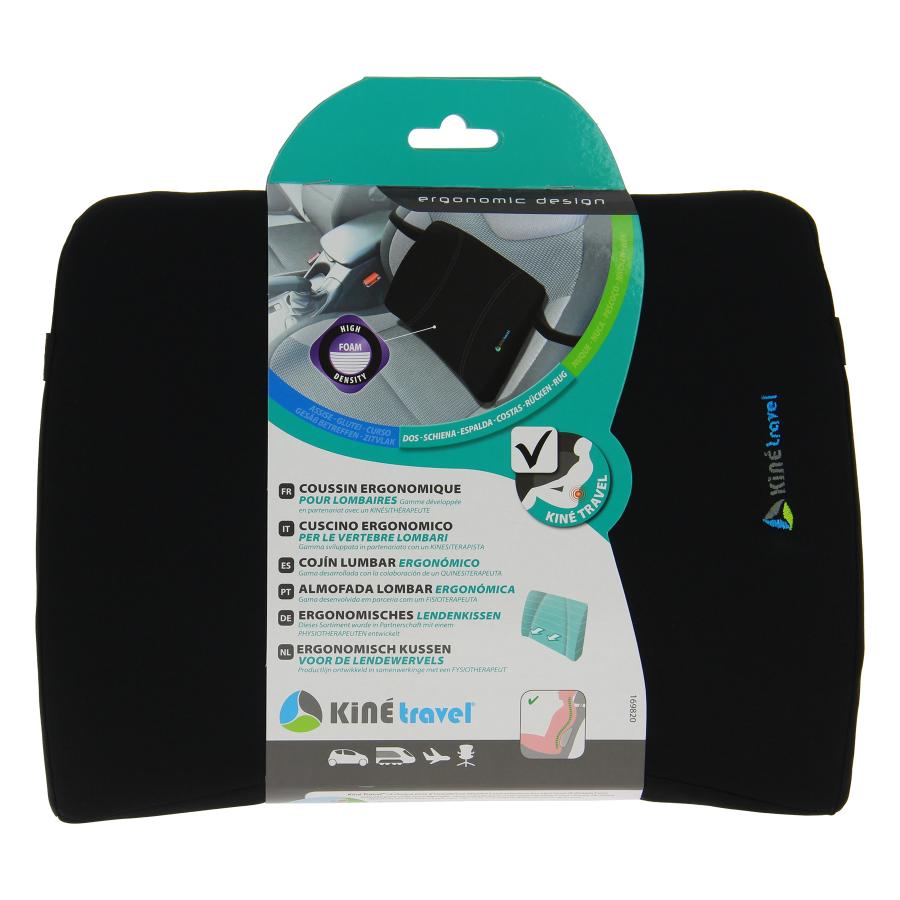 KINE TRAVEL COJÍN LUMBAR ERGONÓMICO 36x27x6CM *Restaura la forma natural de la espalda baja. *Reduce el dolor lumbar *Soporte de asiento elástico La gama Kiné Travel ofrece respuestas a las situaciones de malestar que se observan generalmente durante los viajes y que afectan a la espalda, el asiento y el cuello. Los productos Kiné Travel han sido desarrollados y probados en colaboración con un fisioterapeuta especialista en espalda. Para ofrecer una gama de productos perfectamente adaptados y un confort óptimo. Sentarse supone más tensión para la espalda que cualquier otra posición, incluido estar de pie. Para limitar esta presión, la espalda debe mantener el hueco natural de la columna situado a la altura de las vértebras lumbares. El cojín lumbar restablece este hueco y limita así la tensión sobre las vértebras, al descansar los músculos de la columna. Este modelo con un dise¦o universal se adapta a todo tipo de cuerpo. Este cojín le proporcionará una comodidad duradera en el coche y le permitirá soportar mejor una estancia prolongada. También es adecuado para su uso en la oficina o en casa. Práctica, la banda elástica mantiene el cojín en su lugar. Funda lavable a mano. Tama¦o: 36cm x 27cm x 6cm