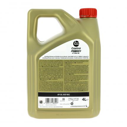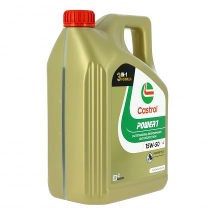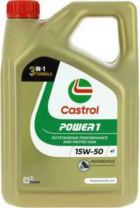 CASTROL POWER1 4T15W50 4L Adecuado para todos los motores de motocicletas de 4 tiempos, tanto carburados como de inyección, para los que se recomiendan especificaciones API SN (o anteriores) y JASO MA o MA2. El nuevo Castrol POWER1 4T con tecnología Power Sustain ayuda a gestionar el calor y la fricción, asegurando una producción continua de energía que permite la aceleración según demanda. Propiedades y beneficios: Resiste el calor y la fricción del motor y ofrece potencia continua, lo que le permite acelerar según sea necesario. Especialmente formulado para adaptarse a viajes largos. El nuevo POWER1 4T 15W-50 combate el espesamiento del aceite provocado por las altas temperaturas. El nuevo POWER1 4T 15W-50 mantiene las prestaciones de tu moto durante largos trayectos. Cumple con los requisitos de los motores equipados con catalizadores. ESPECIFICACIONES/ESTÁNDARES DE LA INDUSTRIA API SN JASO MA-2