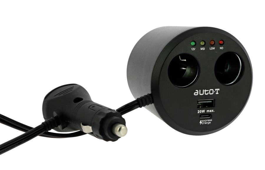 AUTO-T MULTI CONECTOR 12V/24V + 2 USB Para cargar y alimentar varios aparatos a la vez, hasta un máximo de 4: - teléfono - GPS - Cámara de foto - Neveras... Esta estación multi toma está especialmente dise¦ada para adaptarse a los reposa vasos de los vehículos. Características: - 2 tomas encendedor y 2 puertos USB. - Conmutador 12V/24V integrado. - Largo del cable: 1.20 m.