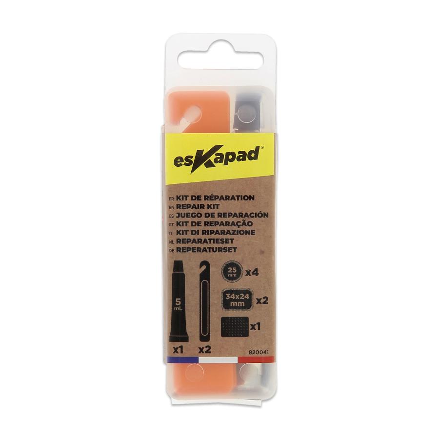 ESKAPAD KIT DE REPARACIÓN COMPLETO Sencillo de usar y fácil de llevar contigo, podrás estar tranquilo cuando salgas a reparar un posible pinchazo. El kit de reparación consta de 1 rallador, 4 piezas de reparación de 25 mm, 2 piezas de reparación de 24*34 mm, 1 tubo de pegamento de 5 g y 2 desmontadores de neumáticos. EsKapad es una marca francesa, creada y desarrollada por dos apasionados del ciclismo. Es en Is}re, cerca de las monta¦as, que nace esta colección y le ofrece combinar evasión, libertad, relajación, al tiempo que garantiza su seguridad y sus reparaciones.