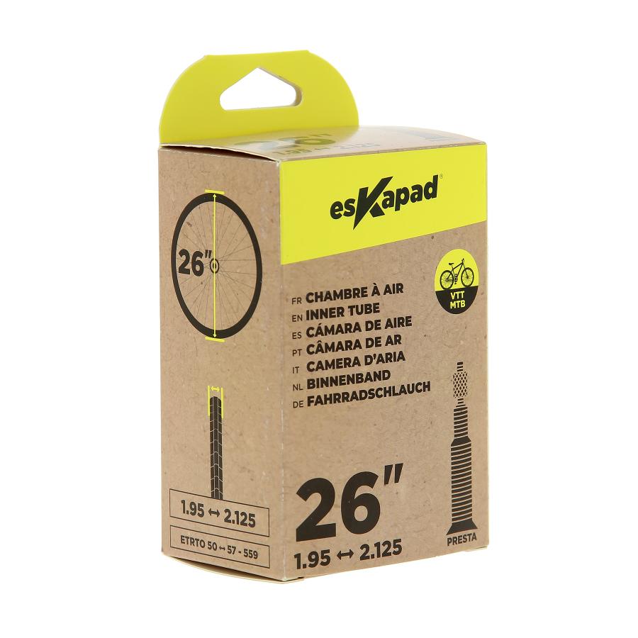 ESKAPAD CÁMARA DE AIRE 26X1,95/2,125V La cámara de aire esKapad está dise¦ada para bicicletas de monta¦a con ruedas de 26 pulgadas de diámetro. Adaptable a tramos de 1,95 a 2,125 con válvula presta. ETRTO 50 - 57 - 559 Materiales: 100% caucho butílico. EsKapad es una marca francesa, creada y desarrollada por dos apasionados del ciclismo. Es en Is}re, cerca de las monta¦as, que nace esta colección y le ofrece combinar evasión, libertad, relajación, al tiempo que garantiza su seguridad y sus reparaciones.