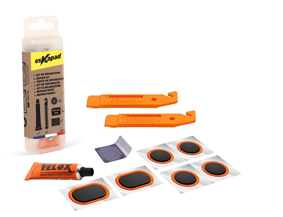 ESKAPAD KIT DE REPARACIÓN COMPLETO Sencillo de usar y fácil de llevar contigo, podrás estar tranquilo cuando salgas a reparar un posible pinchazo. El kit de reparación consta de 1 rallador, 4 piezas de reparación de 25 mm, 2 piezas de reparación de 24*34 mm, 1 tubo de pegamento de 5 g y 2 desmontadores de neumáticos. EsKapad es una marca francesa, creada y desarrollada por dos apasionados del ciclismo. Es en Is}re, cerca de las monta¦as, que nace esta colección y le ofrece combinar evasión, libertad, relajación, al tiempo que garantiza su seguridad y sus reparaciones.