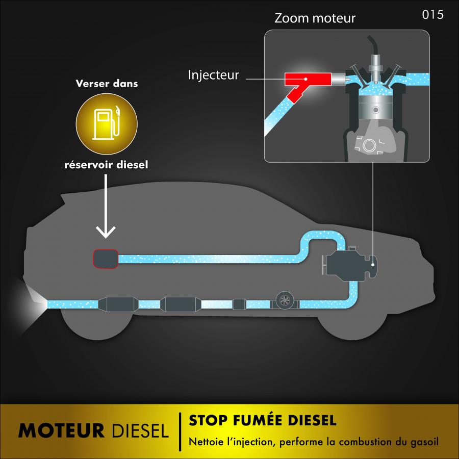 Le Stop-Fumée Diesel nettoie les injecteurs pour optimiser la pulvérisation du gazole. Il augmente l'indice de cétane pour compléter la combustion et décrasser le moteur. Résultat, le rejet de fumées à l'échappement et l'opacité des fumées mesurée lors du Contrôle Technique, sont significativement réduits.