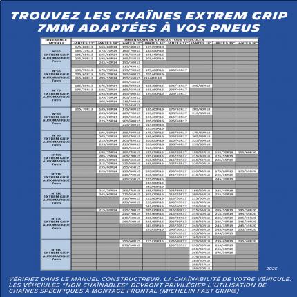 CHAÎNES A NEIGE A TENSION AUTOMATIQUE 7mm. Spécialement conçues pour équiper certains véhicules dits non-chaînables* ou à chaînage particulier* (passage de roue réduit, ou taille basse). Maillons de 7mm pour un encombrement réduit. Convient également aux véhicules chainables. Tension automatique : Montage rapide et sécurisé sans déplacer le véhicule, et sans retendre la chaîne en cours de roulage. Hautes performances : Bande de roulement asymétrique pour des performances maximales en traction, propulsion, virage et freinage sur neige. Butées de protection de jantes et enjoliveurs. Système réfléchissant Night Vision Security. Chaînes à neige compatible pour véhicule électrique Recommandations : Utiliser sur des pneumatiques en bon état, recommandés par le constructeur et dont les dimensions figurent sur l étiquette d affectation du produit. Utilisation pour véhicules de tourisme uniquement. Il est impératif de bien respecter les précautions d utilisation et les instructions de montage et de démontage fournies à l intérieur de ce sac de rangement. CONSEIL ! Pour votre confort, et votre sécurité, entraînez-vous au montage avant utilisation *Compatibilité : Couverture de 80% des modèles de véhicules dits « Non-Chainables » du parc roulant Français. Se reporter au manuel du constructeur pour vérifier si votre véhicule peut être équipé avec ce produit, pour votre taille de pneu.