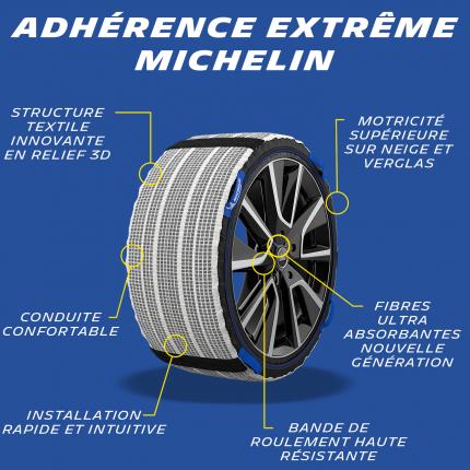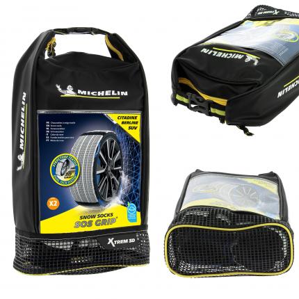SOS GRIP XTREM 3D L'adhérence extrême par Michelin Soyez prêt à affronter l hiver avec une innovation pensée pour votre sécurité. Les SOS GRIP XTREM 3D assurent une motricité supérieure grâce à une technologie avancée, même sur les routes les plus glissantes. - Technologie Dual Tech System : structure textile INNOVANTE en relief 3D HAUTE PERFORMANCE procurant une excellente adhérence & une motricité EXCEPTIONNELLE sur neige et verglas. - Fibres ultra-absorbantes nouvelle génération : elles éliminent instantanément la pellicule d eau entre le pneu et la route, ASSURANT un grip OPTIMAL. - Conduite confortable : Sans vibration pour une tenue de route fluide et agréable. - Installation rapide et intuitive même en conditions difficiles - Durabilité renforcée : La bande de roulement en polyester haute résistante permet au produit de pouvoir être réutilisé sur plusieurs saisons. SOS GRIP XTREM 3D : Parce que performance et sécurité ne font jamais de compromis. Certifiées norme européenne EN16662-1:2020. Conforme à la réglementation française Arrêté ministériel des Transports du 18 juillet 1985 : « DISPOSITIFS ANTIDERAPANTS EQUIPANT LES PNEUMATIQUES ». Contenu : 1 paire de chaussettes textiles, 1 paire de gants, 1 mode d emploi. Compatible véhicule électrique. Adaptées également pour les véhicules avec passage de roue réduits.