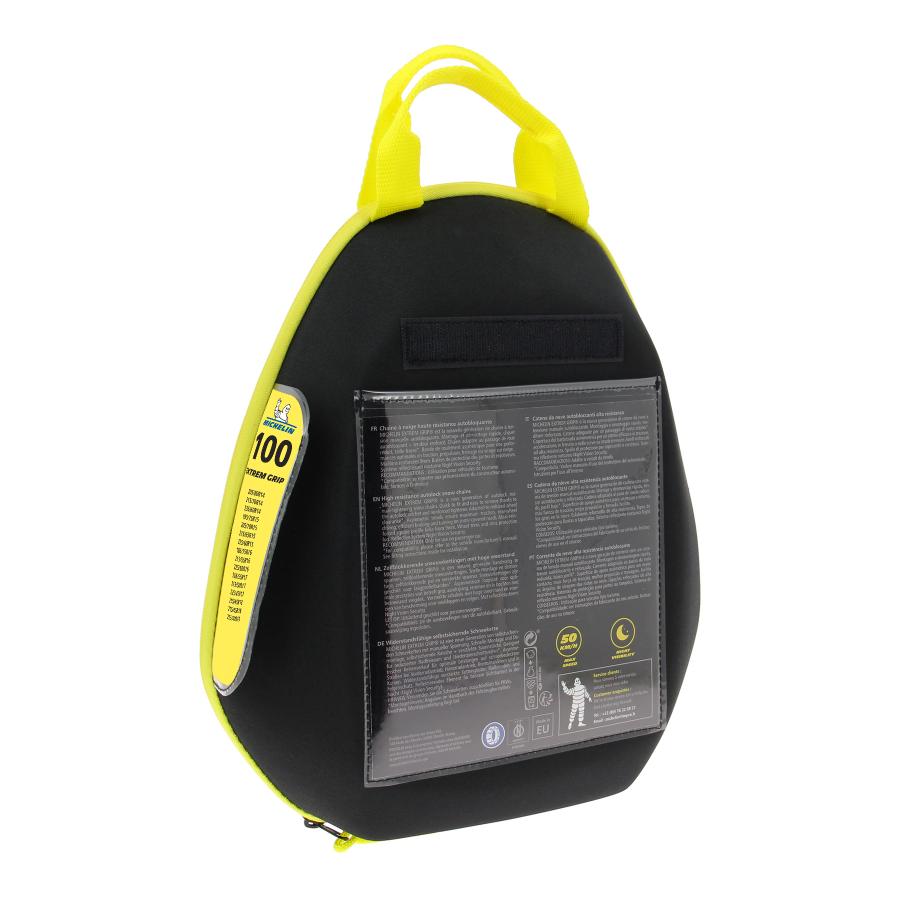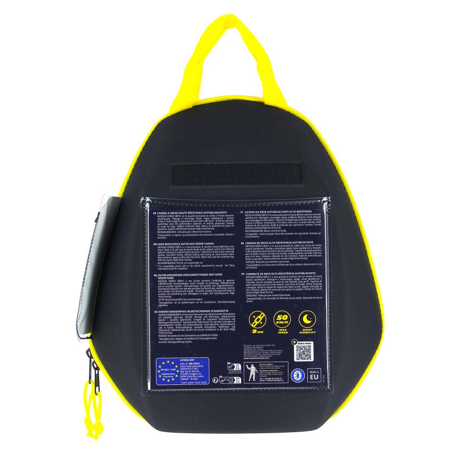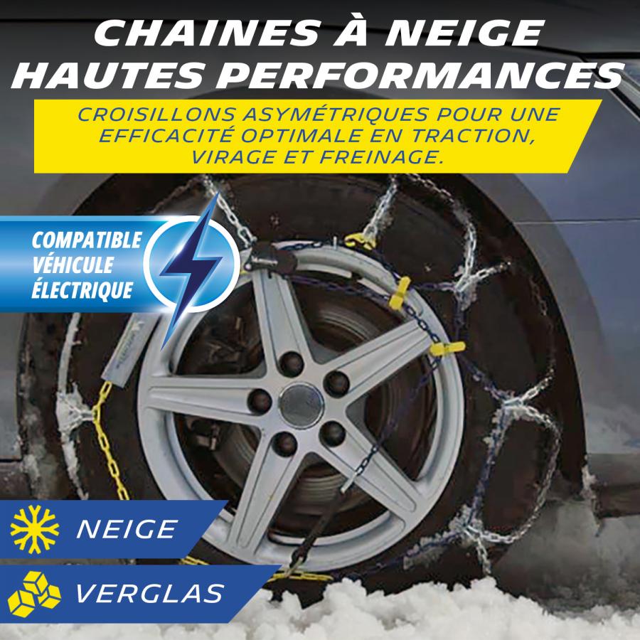 Paire de chaînes à neige homologuée à croisillons asymétriques pour une efficacité optimale en traction, virage et freinage. Visibilité plus : Extrem Grip® est équipé du système réfléchissant NVS -Night Vision Security- de Michelin qui accroît la visibilité nocturne latérale du véhicule. Chaînes à maillons de section carrée 9mm. Tension manuelle autobloquante. Butées de protection des jantes et enjoliveurs Fermeture d'accroche plate et pivotante. Repères de couleurs pour une facilité de montage. Livrées avec 2 maillons de rechange, une paire de gants à manche longue, une notice de montage plastifiée servant de tapis et un manuel utilisateur. Emballées dans une valisette antichocs avec 2 compartiments intérieur pour tenir les 2 chaînes séparées et éviter l'emmêlement.