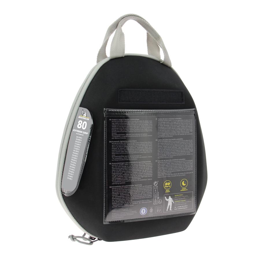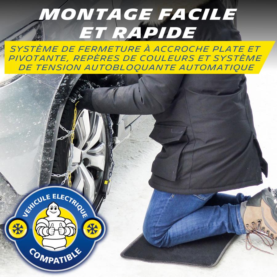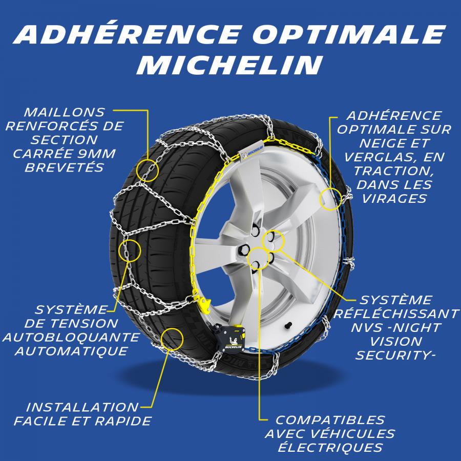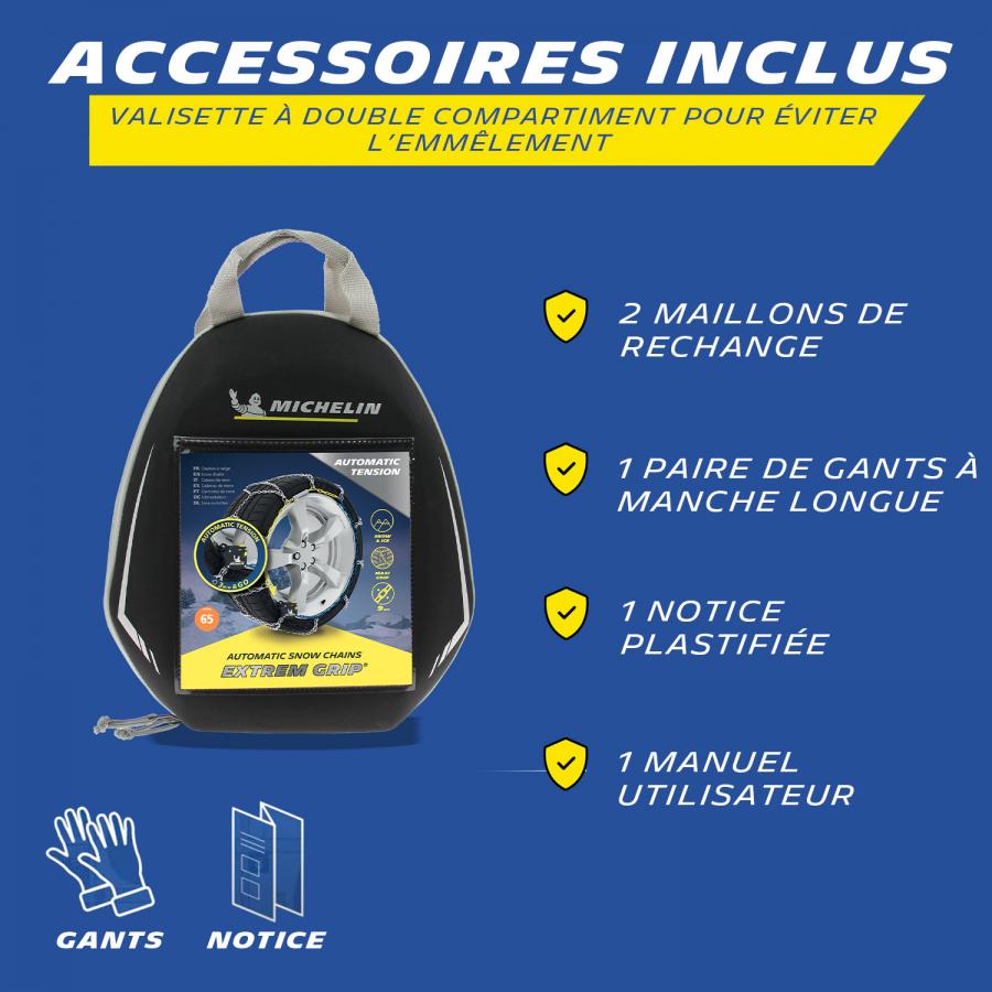Paire de chaînes à neige homologuée à croisillons asymétriques pour une efficacité optimale en traction, virage et freinage. Visibilité plus : Extrem Grip® est équipé du système réfléchissant NVS -Night Vision Security- de Michelin qui accroît la visibilité nocturne latérale du véhicule. Chaînes à maillons de section carrée 9mm. Système de tension autobloquante Automatique et continue en conduite. Démontage automatique. Butées de protection des jantes et enjoliveurs Fermeture d'accroche plate et pivotante. Repères de couleurs pour une facilité de montage. Livrées avec 2 maillons de rechange, une paire de gants à manche longue, une notice de montage plastifiée servant de tapis et un manuel utilisateur. Emballées dans une valisette antichocs avec 2 compartiments intérieur pour tenir les 2 chaînes séparées et éviter l'emmêlement.