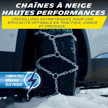 Paire de chaînes à neige homologuée à croisillons asymétriques spéciales SUV, 4x4, Camping-car et véhicules utilitaires. Visibilité plus : Extrem Grip® est équipé du système réfléchissant NVS -Night Vision Security- de Michelin qui accroît la visibilité nocturne latérale du véhicule. Chaînes à maillons de section carrée 13mm. 2 Systèmes de tension autobloquante Automatique et continue en conduite pour une facilité et une rapidité de montage. Butées de protection des jantes et enjoliveurs Repères de couleurs pour une facilité de montage. Livrées avec 2 maillons de rechange, une paire de gants à manche longue, une notice de montage plastifiée servant de tapis et un manuel utilisateur. Emballées dans une valisette antichocs avec 2 compartiments intérieur pour tenir les 2 chaînes séparées et éviter l'emmêlement.