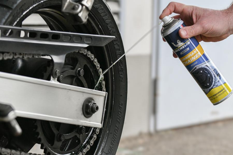 Lubrifiant chaîne spécial pour moto routière. Le Lubrifiant Chaîne Road MICHELIN a été formulé pour vous garantir un résultat optimal. - Lubrifie et protège tous types de chaînes : motos, scooters, karts. - Formule hautes performances : ne coule pas, ne projette pas. - Prolonge la durée de vie de la chaîne. - Réduit les frottements. - Résiste à l'eau. - Protège efficacement contre la corrosion. - Formule active sans chlore : compatible avec les joints toriques (O-ring, X-ring, Z-ring). Aérosol 400ml.