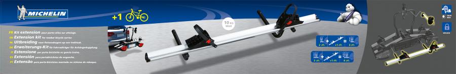 Kit extension pour porte-vélos sur attelage. Extension adaptable sur le porte-vélos Michelin 009066. Permet d'ajouter un vélo supplémentaire et ainsi passer à une capacité de 4 vélos. Equipé d'un système antivol pour le vélo supplémentaire.