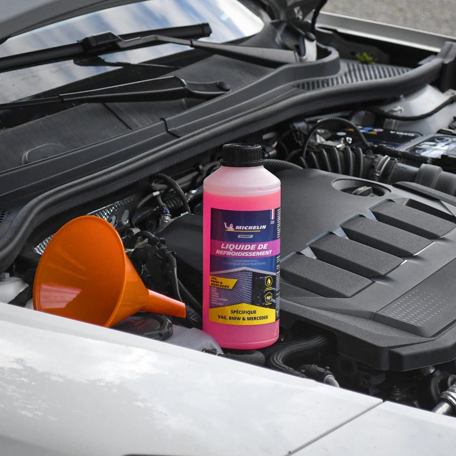 LIQUIDE DE REFROIDISSEMENT MICHELIN 1 LITRE LIQUIDE DE REFROIDISSEMENT SPECIFIQUE VAG BMW A BASE D'ANTIGELS SPECIFIQUES CONTRUCTEURS COMPATIBLE AUDI / SEAT / CUPRA / SKODA / VOLKSWAGEN / BMW / MERCEDES. NORME G12 EVO, COMPATIBLE AVEC LES NORMES PRECEDENTES G13, G12, G12+, G12++ Technologie SI-OAT avec phosphates PSi OAT : : Liquide de refroidissement à base d'éthylène glycol, Contient une technologie de pointe d'inhibiteurs de silicates avec phosphate, soutenue par une solide structure organique (OAT - Organic Additive Technology). Traceur anti-fuite : la formule intègre de la fluorescéine, qui permet de détecter une fuite avec une lampe UV. Protection anti-corrosion renforcée jusqu'à 250 000 km. Spécial hautes températures. Protège de la surchauffe jusqu'à +121°C et du gel jusqu'à -30°C Evite le tartre Pour moteurs essence et diesel Coloris rose.